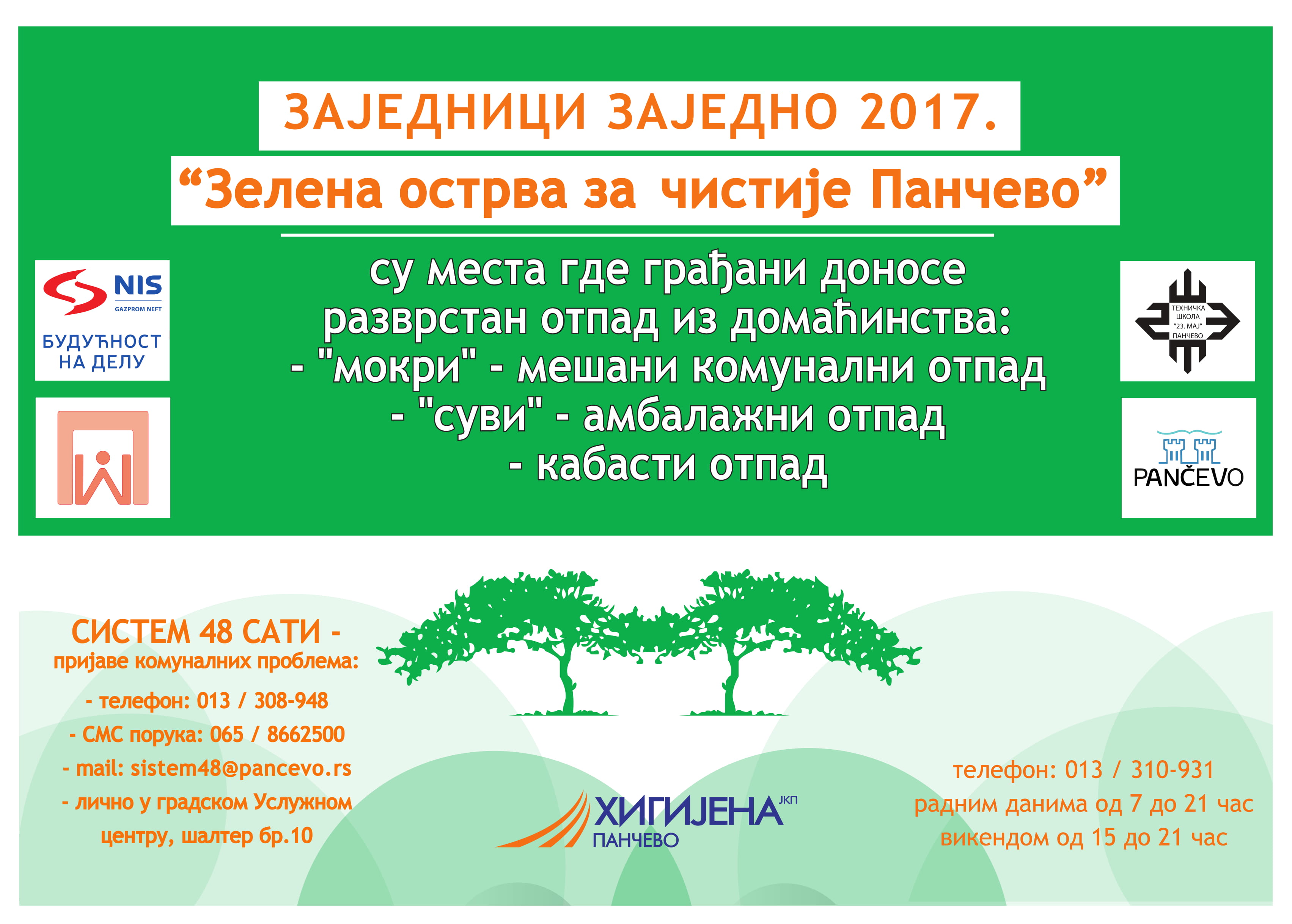 Plakati i nalepnice za info table biće postavljeni na 20 izgrađenih lokacija “zelenih ostrva” na teritoriji Grada Pančeva. Na prostoru “zelenih ostrva” nalaze se kontejneri za “mokar” mešoviti komunalni otpad, “suvi” ambalažni otpad i metalni kontejneri zapremine pet kubika za kabasti otpad iz domaćinstava.
